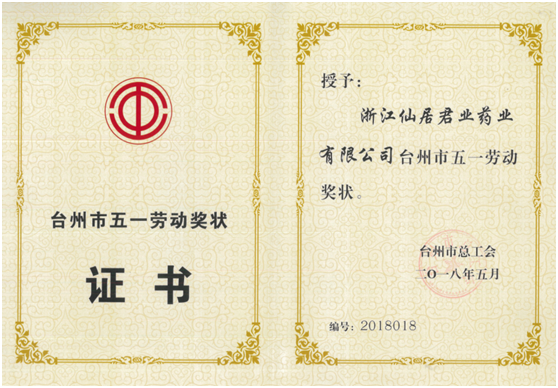 | 浙江仙居君業(yè)藥業(yè)有限公司榮獲“臺州市五一勞動獎狀” 日期:[2018/09/05] |